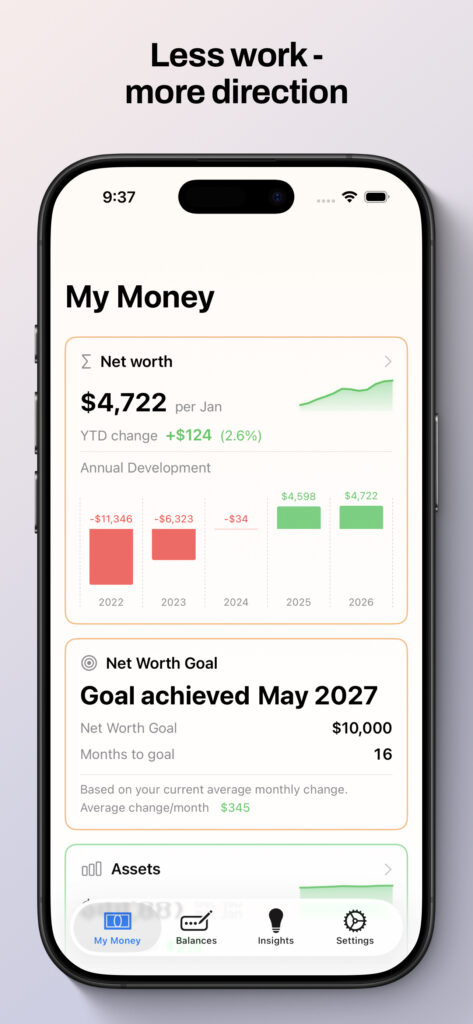 Balans 2.0 is a major step forward. You can still track your net worth with simple monthly inputs—but now you can also set a Net Worth Goal and instantly see when you’re projected to reach it.